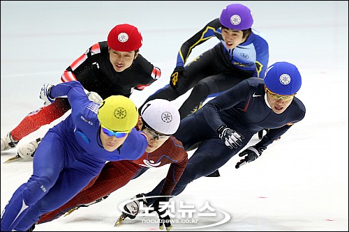 러시아 진출을 결정한 쇼트트랙 안현수 선수(파란색 모자)가 17일 오후 목동 아이스링크에서 열린 제26회 전국남녀 종합쇼트트랙 스피드스케이팅선수권대회 겸 쇼트트랙 국가대표 선발전 1,000M 남자 준결승에서 레이스를 펼치고 있다.