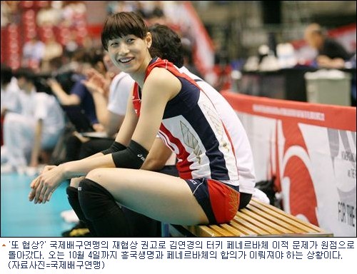 김연경은 지난 시즌 페네르바체에서 유럽 챔피언스리그 우승컵과 MVP를 일군 뒤 몸값이 급상승했다. 원 소속팀인 흥국생명에 페네르바체로 임대가 아닌 완전 이적을 요구했지만 흥국생명은 6시즌을 국내에서 뛰어야 FA(자유계약선수)가 될 수 있다는 KOVO 조항을 들어 거부했다.