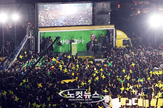 대통령 선거 마지막 주 3차 TV 토론을 앞둔 민주통합당 문재인 대선후보의 15일 오후 서울 광화문 2차 집중유세에 수많은 지지자들이 광장을 가득 메우고 있다.