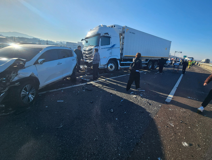 청주 오동동 3순환로서 차량 9대 연쇄 추돌…18명 다쳐 5일 오전 9시쯤 충북 청주시 청원구 오동동 3순환로에서 13t 화물차와 승용차 등 차량 9대가 연쇄 추돌했다. 이 사고로 운전자와 탑승자 등 18명이 다쳤고, 12명은 인근 병원으로 이송됐다. 2025.12.05 11:55