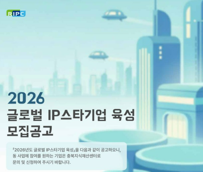 충북지식재산센터, '글로벌 IP스타기업 육성' 참여기업 모집 청주상공회의소 충북지식재산센터가 '글로벌 IP스타기업 육성 사업' 참여기업을 모집한다고 13일 밝혔다. 지식재산(IP)을 기반으로 해외 진출 역량을 강화해 글로벌 IP 강소기업으로 육성하기 위해 추진하는 사업이다. 2026.01.13 15:43