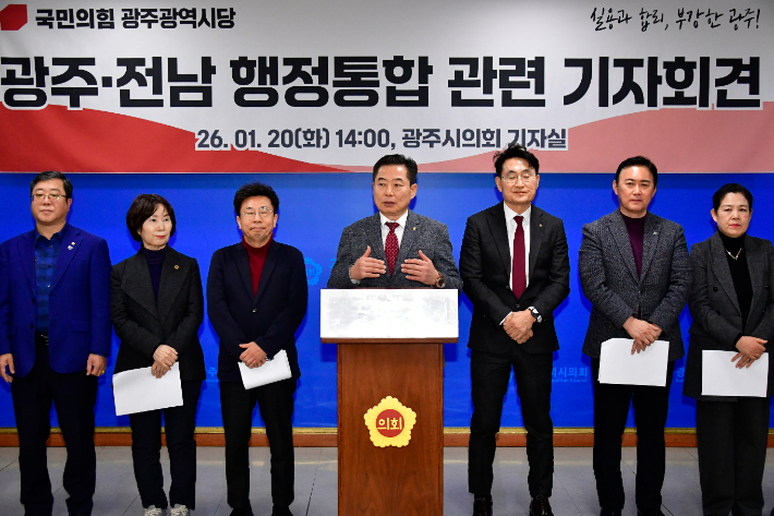 국민의힘 광주시당, 광주·전남 행정통합 '원칙적 찬성' 광주·전남 행정통합 논의를 둘러싸고 국민의힘 광주시당이 원칙적 찬성 입장을 밝히면서도, 정부와 더불어민주당이 시민 의견 수렴 없이 속도전으로 밀어붙이고 있다며 강하게 비판했다. 특히 통합 명칭은 '광주특별시'로 해야 한다고 주장하며, 광주의 역사성과 정체성을 분명히 해야 한다는 입장을 분명히 했다. 2026.01.20 17:26