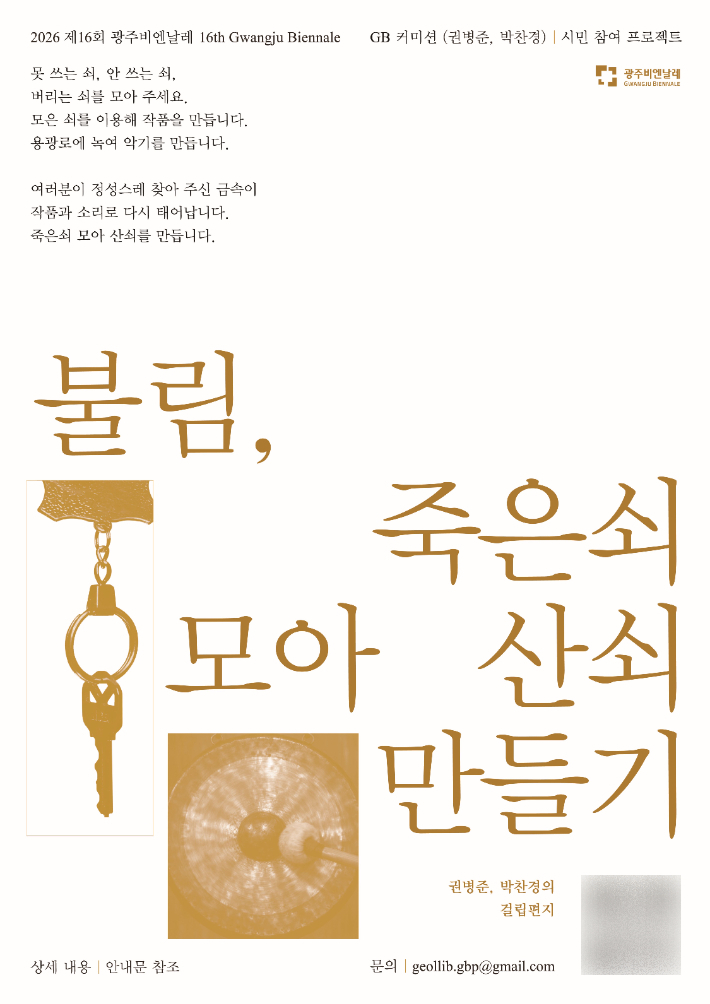 "낡은 냄비가 비엔날레 주인공으로" 광주시, 시민참여 프로젝트 '불림' 추진 "서랍 속 낡은 열쇠, 주방의 찌그러진 냄비가 세계 예술축제 '광주비엔날레의 주인공'이 됩니다." 광주광역시는 오는 9월 5일 막을 올리는 '제16회 광주비엔날레'에서 시민들의 손길로 완성되는 특별한 예술프로젝트 '불림'을 선보인다고 19일 밝혔다. 2026.04.19 07:00