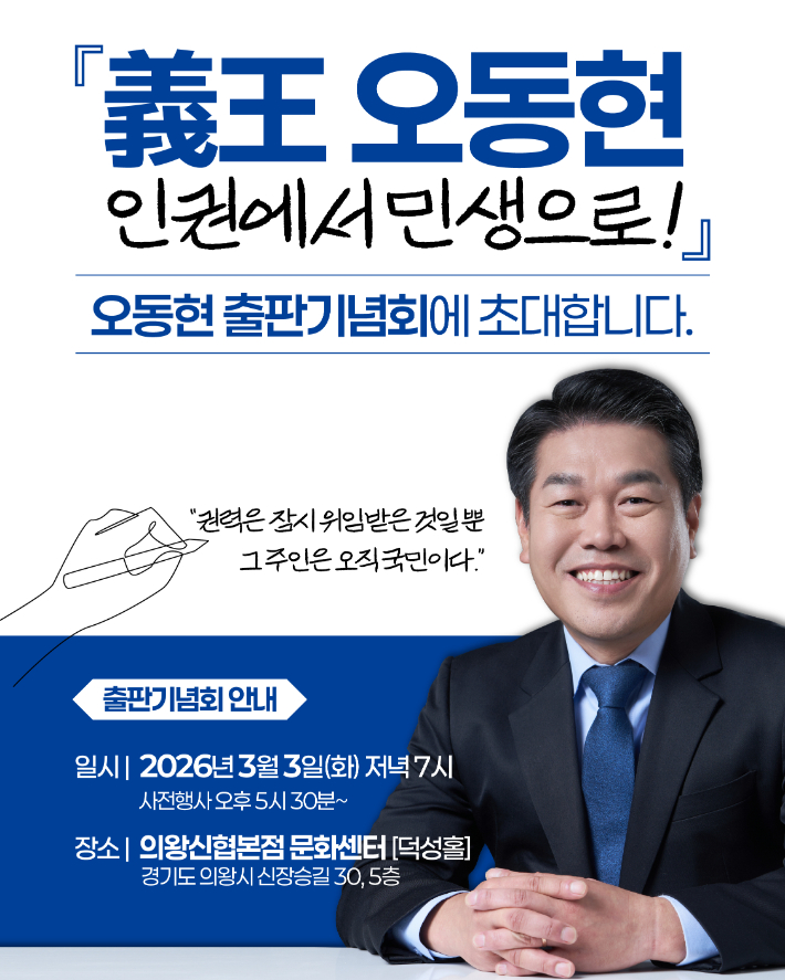 의왕시장 출사표 오동현, '인권에서 민생으로' 출판기념회 개최 경기 의왕시장 선거에 도전하는 오동현 변호사가 '義王(의왕) 오동현 인권에서 민생으로!'를 펴내고 3월 3일 의왕신협본점 문화센터에서 출판기념회를 연다. 2026.02.20 09:51