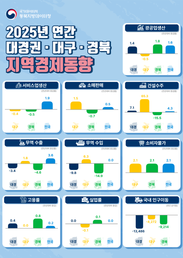 대구·경북, 건설수주액 7% 증가…"대형 수주 영향" 지난해 대구시와 경상북도의 건설수주액이 대폭 증가한 것으로 나타났다. 20일 동북지방데이터청이 발표한 '2025 연간 대경권·대구·경북 지역경제동향'을 보면, 대구·경북권 건설수주액은 9조 6349억 원으로 2024년(8조 9962억 원)보다 7% 상승했다. 2026.02.20 11:34