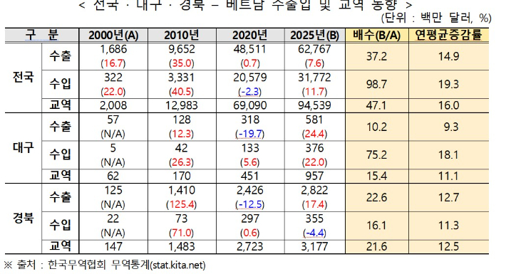 베트남, 대구경북 3대 교역국으로 부상 베트남이 중국과 미국에 이어 대구와 경북의 3대 교역국으로 부상했다. 20일 한국무역협회 대구경북지역본부가 발표한 '대구 경북의 對베트남 교역 및 투자 동향과 시사점' 보고서에 따르면 지난해 베트남과의 교역액 규모는 대구가 9억 6천만 달러, 경북은 31억 8천만 달러로 나타났다. 2026.02.20 14:36