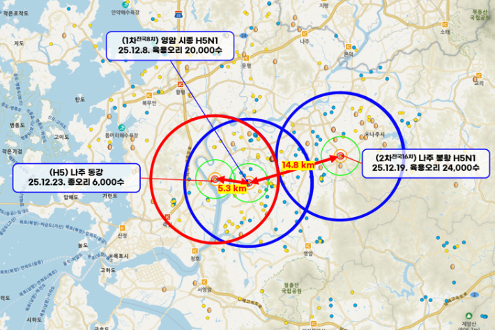 전남 나주 오리서 잇따라 AI 항원 검출 전남 나주 오리에서 잇따라 고병원성 조류 인플루엔자(AI)인 H5형 AI 항원이 검출돼 방역 당국에 비상이 걸렸다. 2025.12.24 07:40
