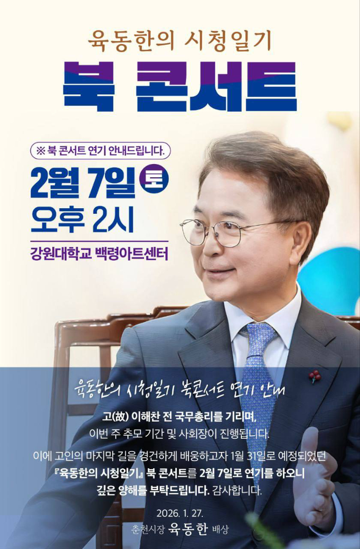 '육동한의 시청일기' 북콘서트 1주 순연…2월 7일 개최 오는 31일 열릴 예정이었던 '육동한의 시청일기' 북콘서트가 1주 순연됐다. 육동한 춘천시장은 31일 예정됐던 북콘서트를 연기하고, 오는 2월 7일 오후 2시 강원대학교 백령아트센터에서 행사를 진행하기로 했다. 2026.01.28 11:55