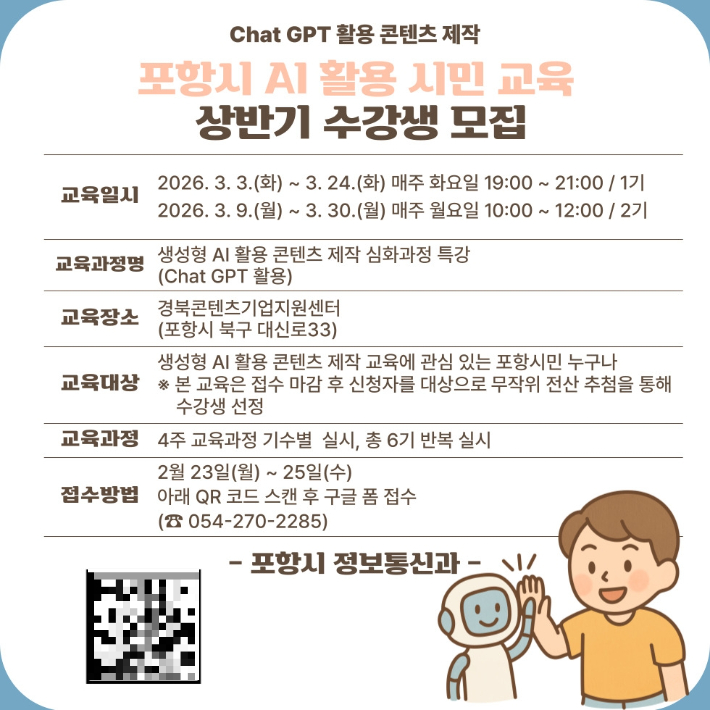포항시, 2026년 상반기 생성형 AI 특강…'시민 누구나 AI 활용' 경북 포항시는 '생성형 AI 활용 콘텐츠 제작 특강' 2026년도 상반기(1·2기) 수강생을 오는 23일부터 모집한다. 이번 특강은 ChatGPT를 활용한 생성형 AI를 실생활과 업무에 즉각적으로 활용할 수 있는 실질적인 학습 기회를 제공하기 위해 마련됐다. 2026.02.19 16:35