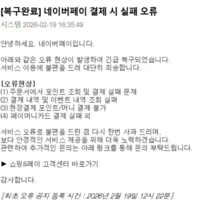 네이버페이 4시간 30분간 결제 오류…"긴급 복구 서비스 정상화" 네이버페이 일부 결제·예약 서비스에서 19일 오후 오류가 발생했으나 약 4시간 35분 만에 복구됐다. 네이버페이에 따르면 이날 낮 12시쯤부터 결제 및 예약 과정에서 시스템 오류가 발생해 이용자들이 불편을 겪었다. 2026.02.19 17:10
