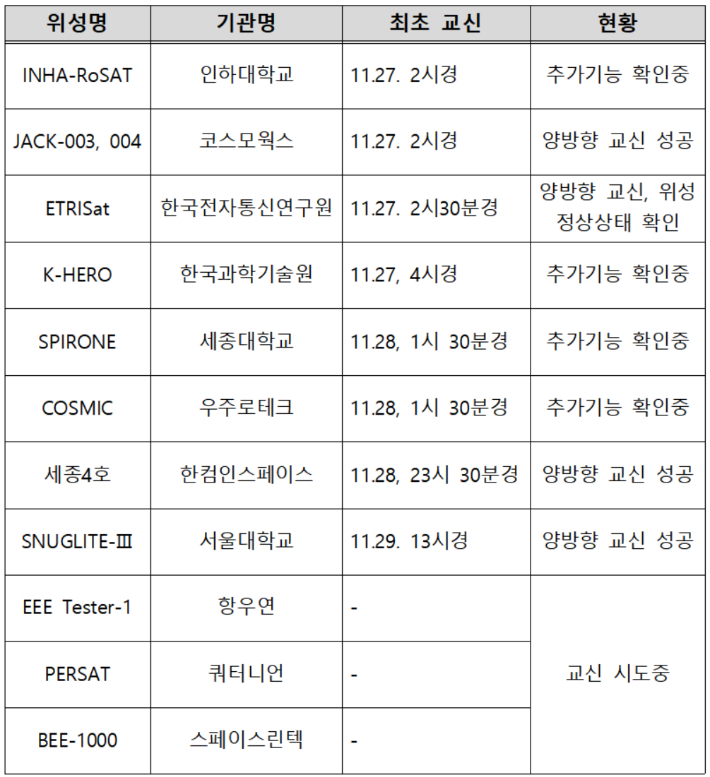누리호 부탑재 위성 12기 중 9기 교신 성공 2일 우주항공청과 한국항공우주연구원이 지난달 27일 새벽 1시 13분 4차 발사에 성공한 한국형발사체 누리호에 실려 600km 고도에서 분리·배출된 부탑재 위성 12기의 교신 결과를 발표했다. 이에 따르면 현재까지 교신에 성공해 위성 상태가 확인된 부탑재 위성은 9기다. 2025.12.02 10:58