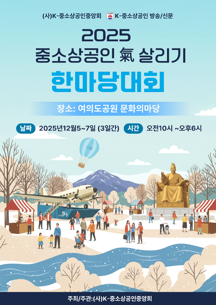 다음 달 여의도서 '중소상공인 기살리기 한마당대회' K-중소상공인중앙회가 주최하는 '중소상공인 기살리기 한마당대회'가 다음 달 5일부터 7일까지 사흘간 여의도공원 '문화의마당'에서 열린다. 이번 행사는 침체된 중소상공인들 사기 진작과 네트워크 강화를 꾀하고 지역 상권에 활력도 불어넣기 위해 마련됐다는 설명이다. 2025.11.11 16:28