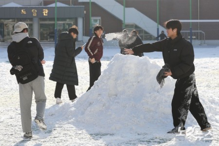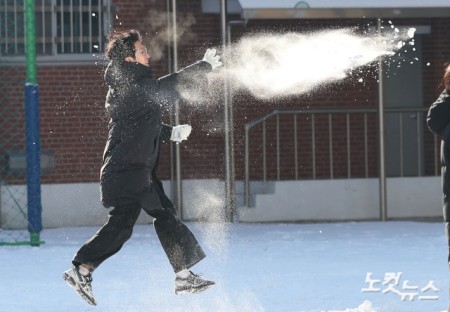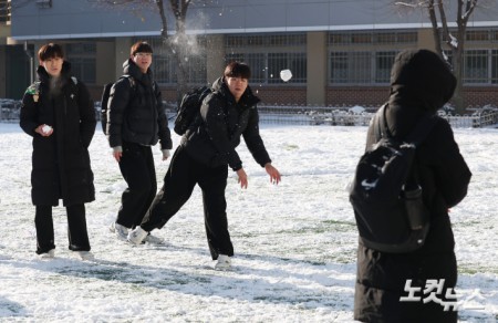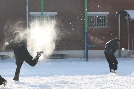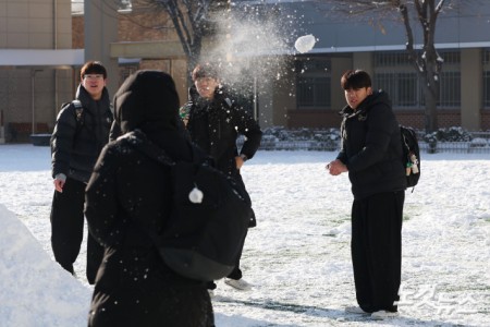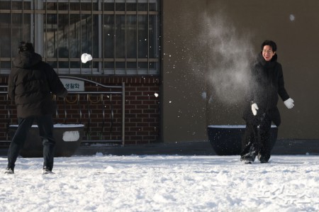 첫눈의 추억 지난밤 내린 기습 폭설로 곳곳에 많은 눈이 쌓인 가운데 5일 서울 광진구 광남고등학교에서 학생들이 눈싸움을 하고 있다. 2025.12.05 12:09