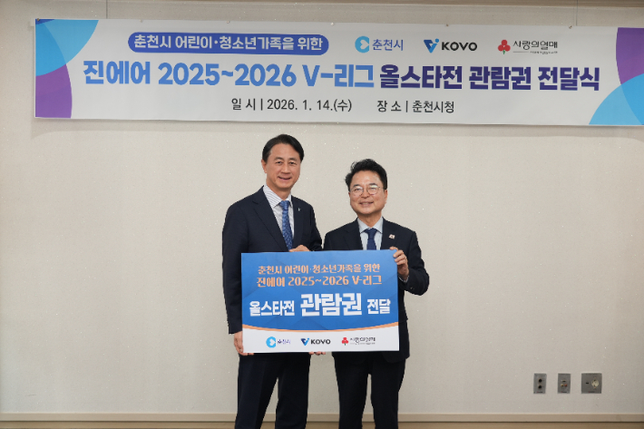 배구연맹, 춘천시에 저소득층 위한 올스타전 관람권 전달 한국배구연맹(KOVO)이 14일 오후 춘천시청에서 춘천 지역 저소득층 어린이와 청소년들에게 프로스포츠 문화 체험 기회를 제공하기 위한 '진에어 2025-2026 V-리그 올스타전' 관람권 전달식을 진행했다. 이날 행사에는 육동한 춘천시장, 이강균 춘천시체육회장, 신무철 한국배구연맹 사무총장이 참석해 자리를 빛냈다. 2026.01.14 20:39