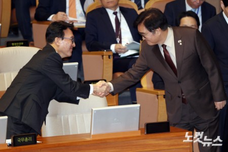 인사하는 우원식 국회의장-김민석 국무총리 10일 서울 여의도 국회에서 열린 제432회국회(임시회) 제5차 본회의에서 우원식 국회의장과 김민석 국무총리가 인사를 하고 있다. 2026.02.10 14:55