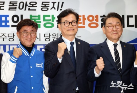 돌아온 송영길 송영길 전 더불어민주당 대표(가운데)가 20일 오후 인천 남동구 더불어민주당 인천시당에 복당신청서를 접수하기 전 기념촬영 하고 있다. 2026.02.20 15:26