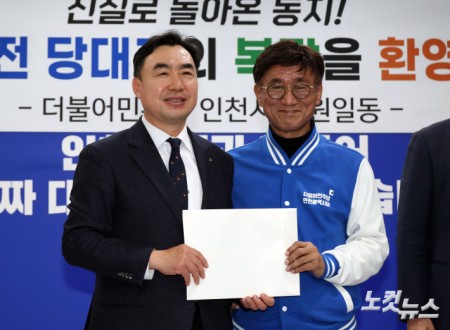 윤관석, 민주당 복당 신청 윤관석 전 의원(왼쪽)이 20일 인천 남동구 더불어민주당 인천시당에 복당신청서를 접수하고 있다. 2026.02.20 15:26