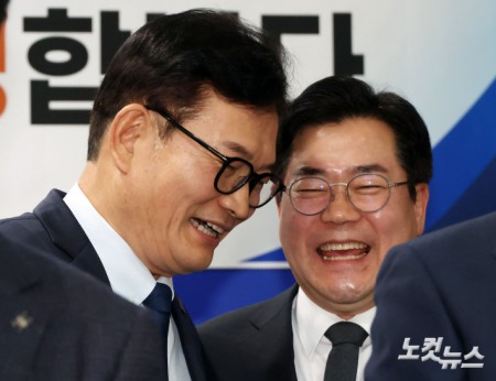 대화하는 송영길-박찬대 송영길 전 더불어민주당 대표가 20일 인천 남동구 더불어민주당 인천시당에 복당신청서를 접수 후 미소지으며 박찬대 의원과 대화하고 있다. 2026.02.20 15:25