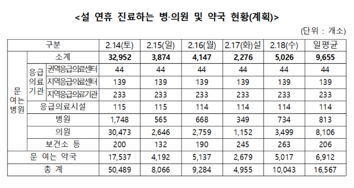 설 연휴 병의원 9600곳 운영…"응급의료 24시간 가동" 설 연휴 기간에도 응급의료기관 416곳이 평소와 똑같이 24시간 진료를 이어간다. 또 연휴 동안 국민들이 가까운 동네 병·의원에서 안심하고 진료를 받을 수 있도록 하루 평균 병·의원 약 9600여 곳이 문을 열 예정이다. 보건복지부는 12일 설 연휴(2월 14일~2월 18일)를 앞두고 이 같은 내용을 담은 연휴 기간 의료기관 이용 방안을 안내했다. 2026.02.12 12:00