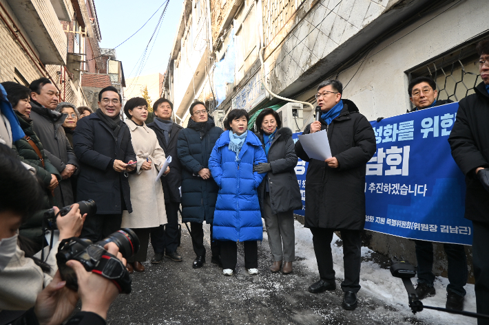 민주당 "오세훈, 재개발 지정만 신속…이후엔 대책 없다" 더불어민주당이 서울 부동산 공급난의 원인이 오세훈 시장의 '보여주기식 행정'에 있다며 재개발·재건축 사업을 활성화시켜야 한다고 주장했다. 민주당 서울시당은 14일 서울 성북구 장위뉴타운 14구역을 찾아 주거환경 개선 재개발·재건축 활성화 지원방안을 위한 현장간담회를 진행했다. 2026.01.15 18:17