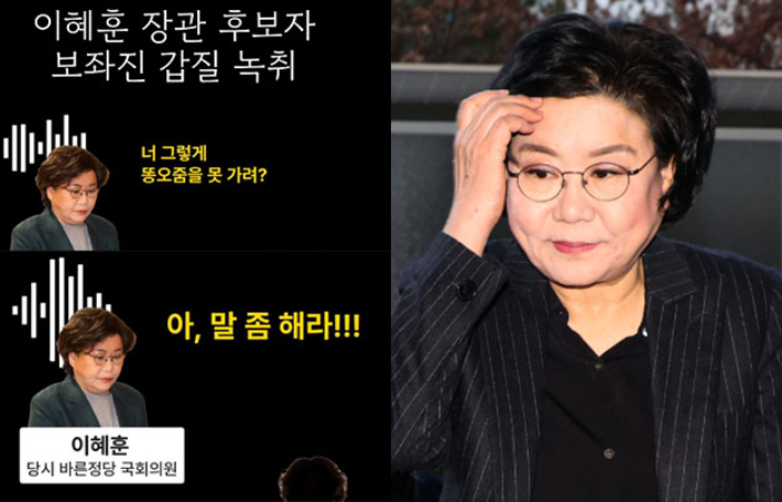 이혜훈 "너 똥오줌도 못 가리냐?"…이번엔 보좌진에 심야 폭언 이혜훈 기획예산처 장관 후보자가 과거 보좌진에게 한밤중 전화를 걸어 폭언하는 음성파일이 공개됐다. '아이큐 인턴 갑질'에 이어 두 번째 음성 파일 폭로다. 9일 주진우 국민의힘 의원은 자신의 페이스북에 "이 후보자의 보좌진 갑질 음성을 최초로 공개한다"며 "밤 10시 25분쯤 보좌진에게 전화해 폭언과 막말을 쏟아냈다"고 영상을 공개했다. 2026.01.09 11:16