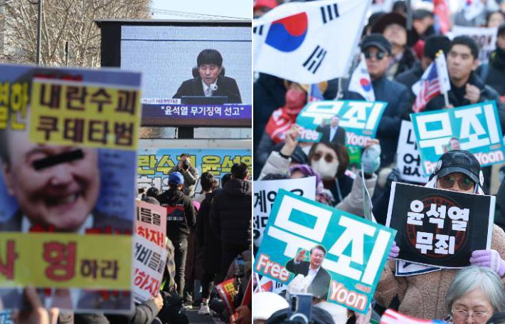 지귀연 한마디마다 환호·욕설 교차…尹 '무기징역'에 일동 '탄식' "피고인 윤석열을 무기징역에 처합니다." 대형 전광판을 통해 흘러나온 서울중앙지법 형사합의25부 지귀연 부장판사의 선고에 서울중앙지법 앞 서초동 교대역 9번 출구 인근의 윤석열 전 대통령 지지자들은 일제히 탄식했다. 곳곳에서 "장난하냐", "이게 나라가 맞냐"며 고성과 욕설이 터져 나왔다. 2026.02.19 18:31