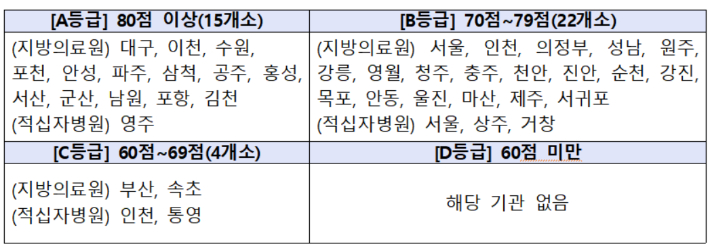이천·남원·홍성 등 15곳 A등급…지방의료원 운영 개선 올해 지역거점공공병원의 운영성과가 전반적으로 개선된 것으로 나타났다. 보건복지부는 2일 '2025년 지역거점공공병원 운영평가' 결과를 공개하고, 지방의료원과 적십자병원 41개 기관의 평균 점수가 77.9점으로 전년보다 4.3점 올랐다고 밝혔다. 2025.12.02 15:55