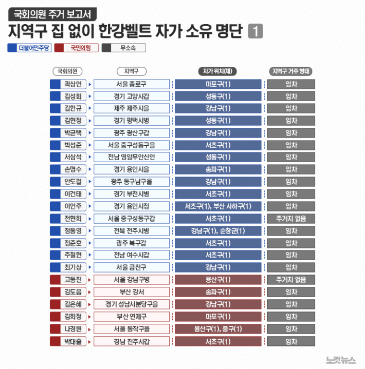 '한강벨트'에 자가 소유 국회의원 41명…지역구엔 집 없어 ▶ 글 싣는 순서 ①'한강벨트'에 자가 소유 국회의원 41명…지역구엔 집 없어 ②금배지들 '부동산 모럴해저드'…지역구엔 전세, 서울엔 자가 ③서울에 자가, 지역구도 자가…다주택 의원 20명에 물어보니