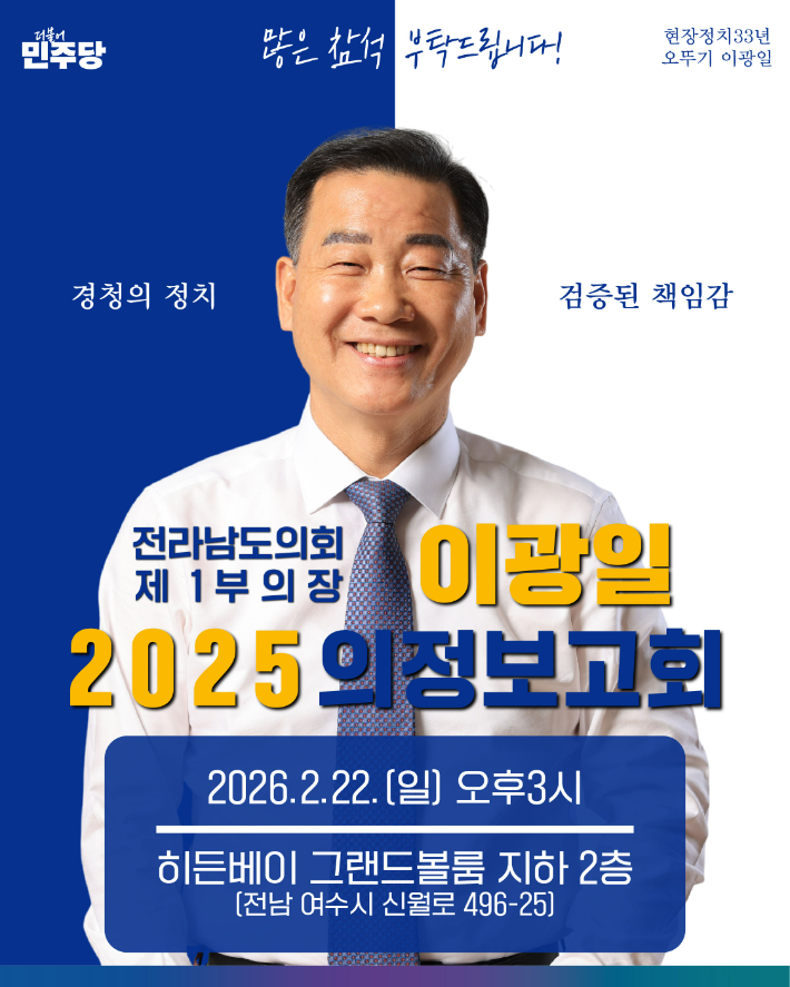 이광일 전남도의회 제1부의장, 22일 여수 의정보고회 개최 이광일 전라남도의회 제1부의장이 2월 22일 오후 3시 히든베이호텔 그랜드볼룸 지하 2층에서 의정보고회를 개최한다. 이번 의정보고회는 전라남도의회 제1부의장으로서 수행한 의정활동 전반을 시민들에게 보고하기 위해 마련됐다.