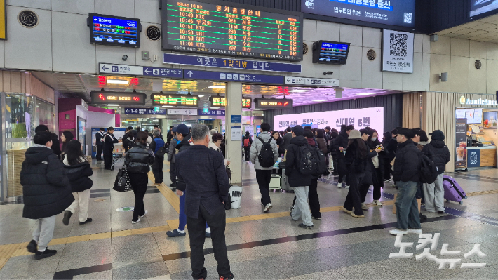 "가족들과 보게 돼 좋다"…귀성길 나선 시민들 설 연휴를 하루 앞둔 13일 오전 동대구역은 일찍이 귀성길에 나선 시민들로 북적였다. 시민들은 한 손에는 캐리어, 한 손에는 과일 세트와 미역, 김 등 명절 선물을 쥐고 바쁘게 걸음을 옮겼다.