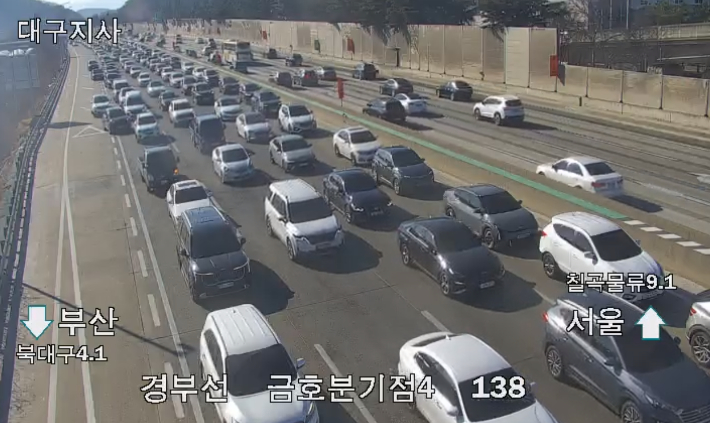 설 당일 '대구→서울' 6시간 20분 소요 예상…고속도로 곳곳서 정체 설 당일인 17일 대구·경북권 주요 고속도로 곳곳에서 정체가 빚어지고 있다. 한국도로공사에 따르면 이날 오후 4시 기준 경부고속도로 부산 방향 북대구IC 부근 135km 지점에서 승용차 교통사고로 인해 도로 정체가 빚어지고 있다.