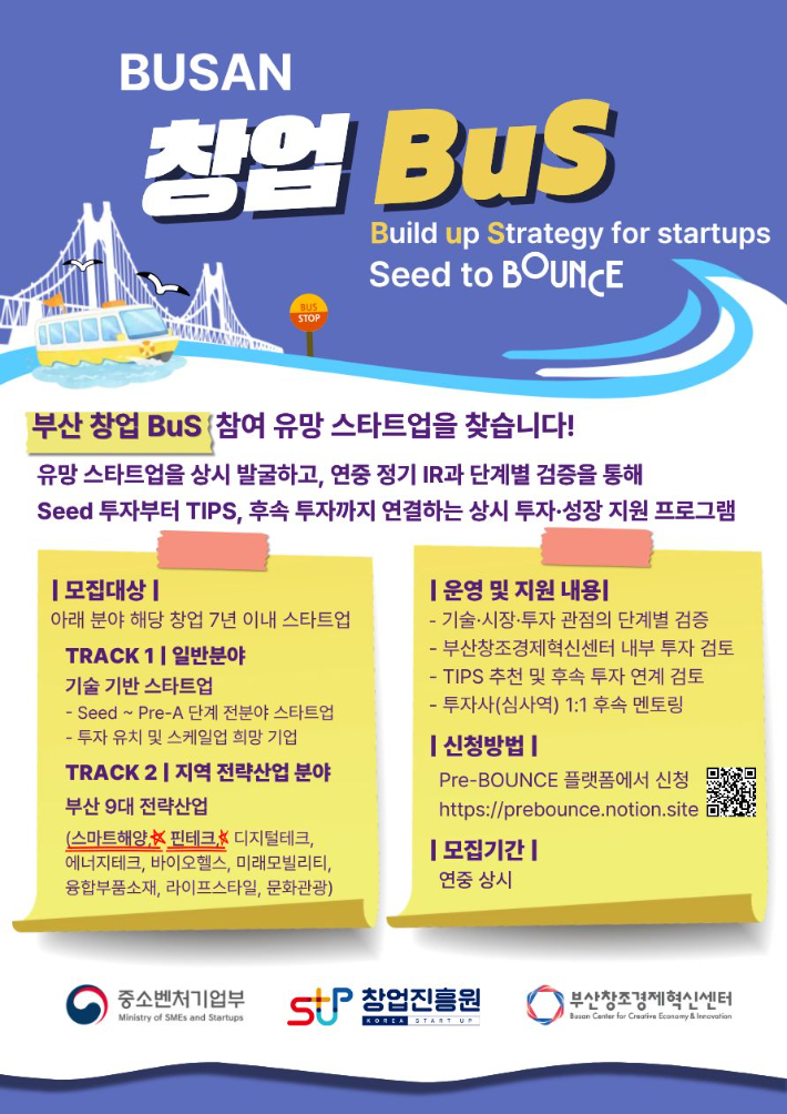 "스타트업 발굴부터 투자까지 한 번에" 부산창경, '창업-BuS' 가동 부산창조경제혁신센터(이하 부산창경)부산창경은 지역의 유망 딥테크 스타트업을 상시 발굴하고 신속한 투자를 지원하는 '창업-BuS(Build up Strategy for Startups)' 프로그램을 본격 시행한다고 13일 밝혔다. 이번 사업은 지역 스타트업들이 겪는 투자 유치와 정보 부족 문제를 해결하기 위한 '성장 전략 세우기' 프로젝트다.