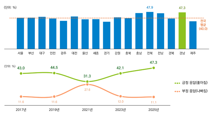 "살기 좋아졌다" 경남 도민 체감도 전국 최상위…복지·문화 '전국 1위' 경남 도민들이 체감하는 생활 여건이 최근 몇 년 사이 비약적으로 개선되며 전국 최상위권 수준이라는 분석 결과가 나왔다. 경남연구원은 국가데이터처의 사회조사 자료(2017~2025년)를 토대로 분석한 '경남 도민의 삶은 어떻게 달라졌나' 이슈 리포트를 발간했다고 17일 밝혔다.