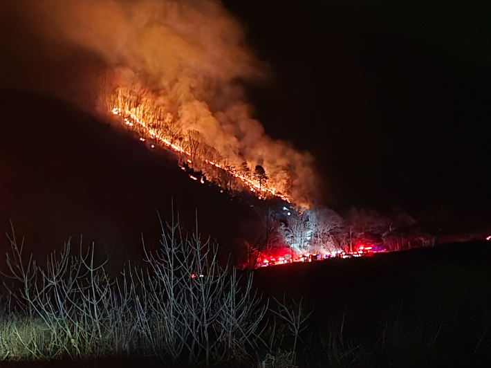 함양군 산불 강풍 타고 이틀째…대응 1단계 발령에 주민대피 명령 경남 함양군의 한 야산에서 발생한 산불이 밤새 번지면서 산림·소방당국이 주불을 잡는 데 총력전을 펼치고 있다. 22일 경상남도에 따르면, 전날 밤 9시 14분쯤 함양군 마천면 창원리의 한 야산에서 발생한 산불이 12시간 넘게 이어지고 있다.