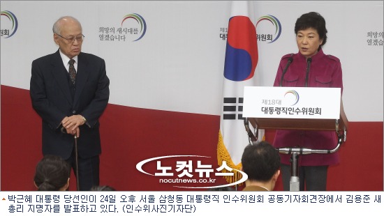 박 당선인이 24일 인수위 기자회견장을 방문해 김용준 인수위원장을 총리 후보로 지명하자 기자들이 크게 술렁였다.