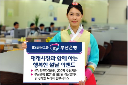 전통시장을 포함한 모든 가맹점에서 부산은행 BC카드로 5만원 이상 결제하면 2~3개월 무이자 할부 서비스를 다음 달 28일까지 받을 수 있다.