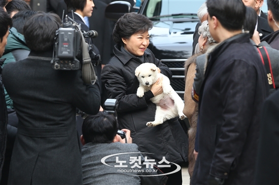 박근혜 대통령이 25일 오전 서울 강남구 삼성동 자택에서 나와 시민들로 부터 진돗개를 선물 받고 있다. 첫 여성 대통령 시대를 여는 제18대 대한민국 박근혜 대통령의 취임식은 국회의사당 광장에서 약 7만명의 국민이 운집한 가운데 세대를 아우르는 국민대통합을 기치로 열린다.
