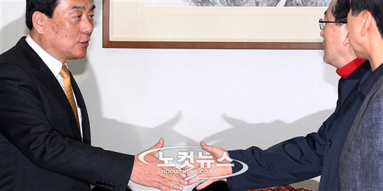 정부조직법 개정안 협상과 관련 17일 오후 국회에서 새누리당 이한구 원내대표와 민주통합당 박기춘 원내대표가 악수를 하고 있다.