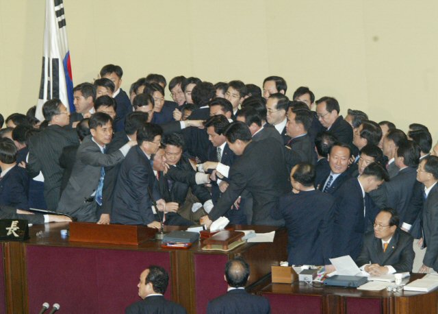 의석에서 지켜보던 정동영 열린우리당 의장은 오열하며 의장석을 향해 명패와 서류를 내던졌고, 김근태 원내대표도 눈물을 흘리며 오열했으며 김원기 의원도 착잡한 표정으로 몸싸움을 지켜봤다.