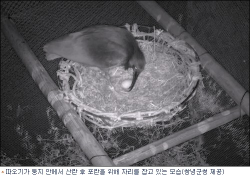 따오기 부부는 지난 1월부터 번식기에 접어들면서 지난달부터 짝짓기에 들어가 올해 첫 산란에 성공했다.