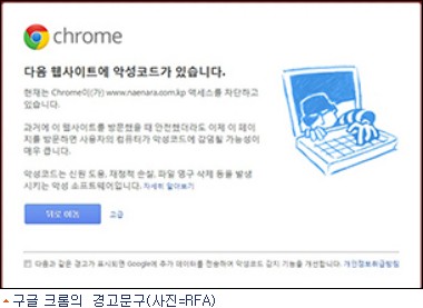 미국의 북한경제분석 웹사이트인 ''노스 코리안 이코노믹 왓치''(North Korean Economic Watch)는 지난 25일 구글 크롬측 관계자를 인용해 "지난 15일까지 90일동안 내나라 웹사이트에 있는 5천628쪽을 분석한 결과 18쪽에서 악성코드152개를 발견했다"고 밝혔다.