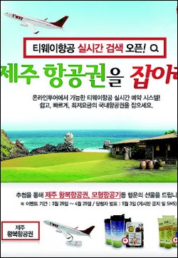 ㈜온라인투어(박혜원, www.onlinetour.co.kr)가 저가항공사 티웨이항공의 국내 실시간항공 입점을 기념한 ''티웨이 타고 제주항공권을 잡아라'' 이벤트를 4월 25일까지 진행한다.