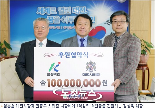 금성백조주택은 4일 오전 대전시청을 방문해 2013년 대전시티즌 후원 협약식을 맺고 후원금 1억 원을 염홍철 시장과 대전시티즌 전종구 사장에게 전달했다.