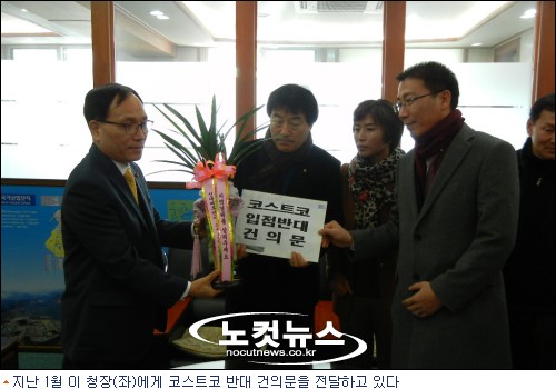 지난 1월 이 청장(좌)에게 코스트코 반대 건의문을 전달하고 있다