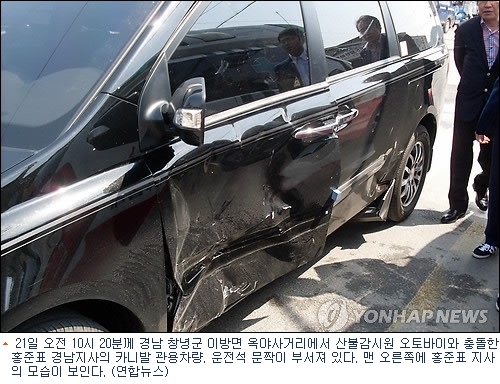 21일 오전 10시 25분쯤 경남 창녕군 이방면 거남리 옥야사거리에서 홍준표 경남지사가 탄 관용차와 산불 감시원이 탄 오토바이가 부딪혔다.