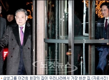 ◈ ''''130억''''.. 연봉 0원, 하지만 서울에서 가장 비싼 회장님의 집값. 서울시 개별주택 공시가격 발표. 방상훈 사장 제치고 1위~5위 삼성家가 휩쓸어.이> 130억 원. 서울에서 가장 비싼 집값입니다. 삼성그룹 이건희 회장의 집이 우리나라에서 가장 비싼 집이라는 통계가 나왔습니다. 지난해 보다 12억 원이 오른 건데요. 재미있는 건, 1위가 이건희 회장의 이태원동 자택, 2위도 역시 이 회장의 삼성동 자택, 3위는 한남동 자택이라는 겁니다. 각각 104억 원과 102억 원씩입니다.