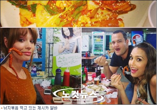 공개된 사진 속 제시카 알바는 함께 내한한 배우 제이미 패트리코프, 메이크업 아티스트 로렌 앤더슨 등과 매운 낚지볶음과 회를 먹으며 즐거운 분위기를 연출했다.