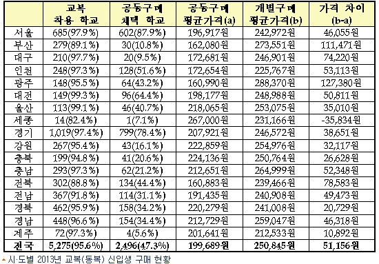 시.도별 공동구매 채택비율은 서울이 87.9%, 경기 78.4%, 대전 64.4% 순이었고 세종과 제주는 각각 7.1%, 5.6%로 상대적으로 채택 비율이 낮았다. 교복 구매현황은 전국 중.고교 5천516교를 대상으로 시.도별로 공동구매 가격과 개별구매 가격을 비교해 볼 수 있도록 최초로 실시한 조사다.