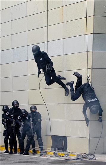 7일 오후 서울 광진구 더 클래식500 빌딩에서 ''초고층 빌딩 테러·화재 대응훈련''이 열리고 있다.