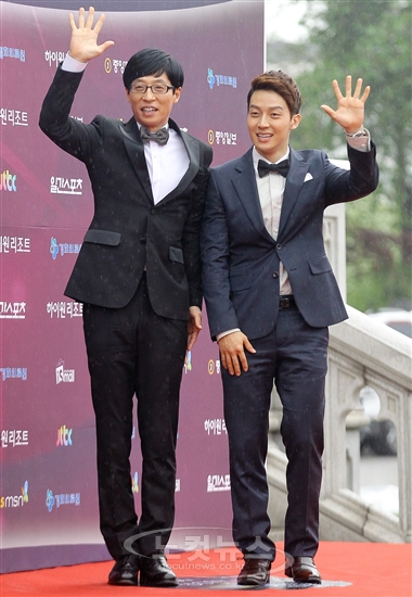방송인 유재석과 허경환이 9일 오후 서울 경희대학교 평화의 전당에서 열린 제49회 백상예술대상에서 레드카펫을 밟고 있다.